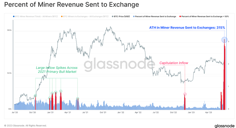 Данные аналитической платформы Glassnode показывают, что в последнее время майнеры биткоина стали отправлять на биржи рекордно высокие суммы в криптовалюте. Лишь за последнюю неделю на криптоплощадки отправлен рекордный объем криптовалюты на общую сумму $ 128 млн. Этот показатель в 4 раза превышает размер их суточного дохода, отмечают аналитики. В 2021 году, во время бычьего периода на криптовалютном рынке, также наблюдался ряд крупных всплесков переводов доходов майнеров на биржи, поскольку те фиксировали прибыль. В 2022 году на фоне краха крипторынка майнеры отправляли крупные суммы заработанных биткоинов на биржи. Тогда специалисты Glassnode обозначили это как «капитуляцию» на фоне падения цен. Чаще всего майнеры отправляют прибыль от добычи биткоина на биржи, готовясь обналичить средства в криптовалюте с целью покрытия расходов и фиксации прибыли. На прошлой неделе курс первой криптовалюты достиг локального максимума за весь год, 24 июня BTC достиг отметки $ 31 185. Пока продажи ма