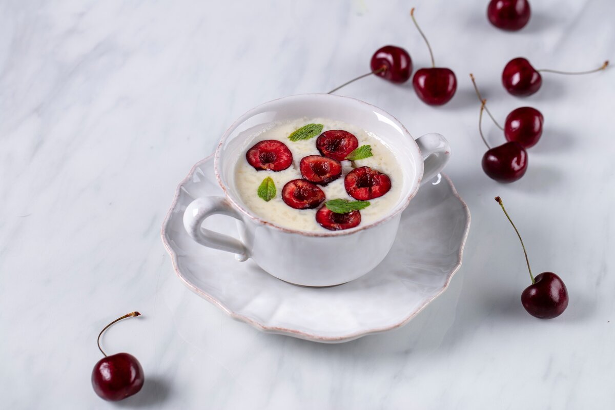 - К рису добавить топленное молоко, сахар по вкусу, 2 ст. л маринованной черешни, поварить до полной готовности риса.