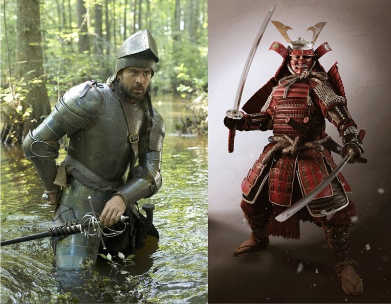 Есть даже реальная история про то, как, испанские пираты покрошили самураев веке в 17-18. Легко ищется в сети. Это их знаменитое японское фехтование на мечах против европейской школы - как бонсай против дуба. Для фильмов Тарантино - в самый раз)).