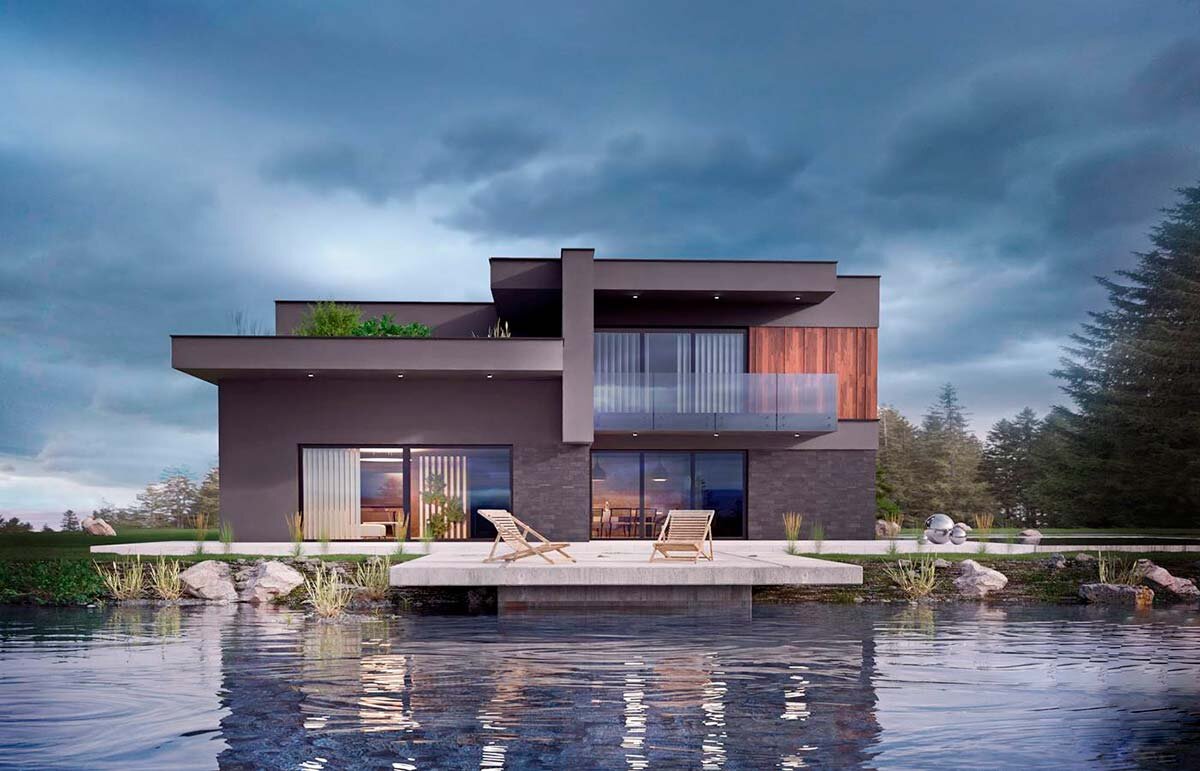 Двухэтажный жилой дом у пруда в современном стиле имеет плоскую крышу. Строгие геометрические формы здания с выступающими элементами придают зданию стильную элегантность. Большие панорамные окна и остекленный балкон на втором этаже делают внутреннее пространство светлым и одновременно «облегчают» фасадную часть дома. Часть крыши использована для создания зеленой зоны с высаженными растениями. Для удобного и безопасного выхода к пруду у дома обустроена специальная площадка, на которой можно установить шезлонги и зонты для создания комфортной зоны отдыха. Это может быть идеальным местом для проведения времени с семьей или друзьями, а также для организации открытых вечеринок или барбекю. ПРЕИМУЩЕСТВА Проекты домов на берегу озера с плоской крышей представляют интересную и гармоничную концепцию, которая отличается рядом преимуществ. Их перечень включает: Проект дома у пруда может иметь повышенную инвестиционную ценность. Вода и природная красота пруда могут увеличить привлекательность нед