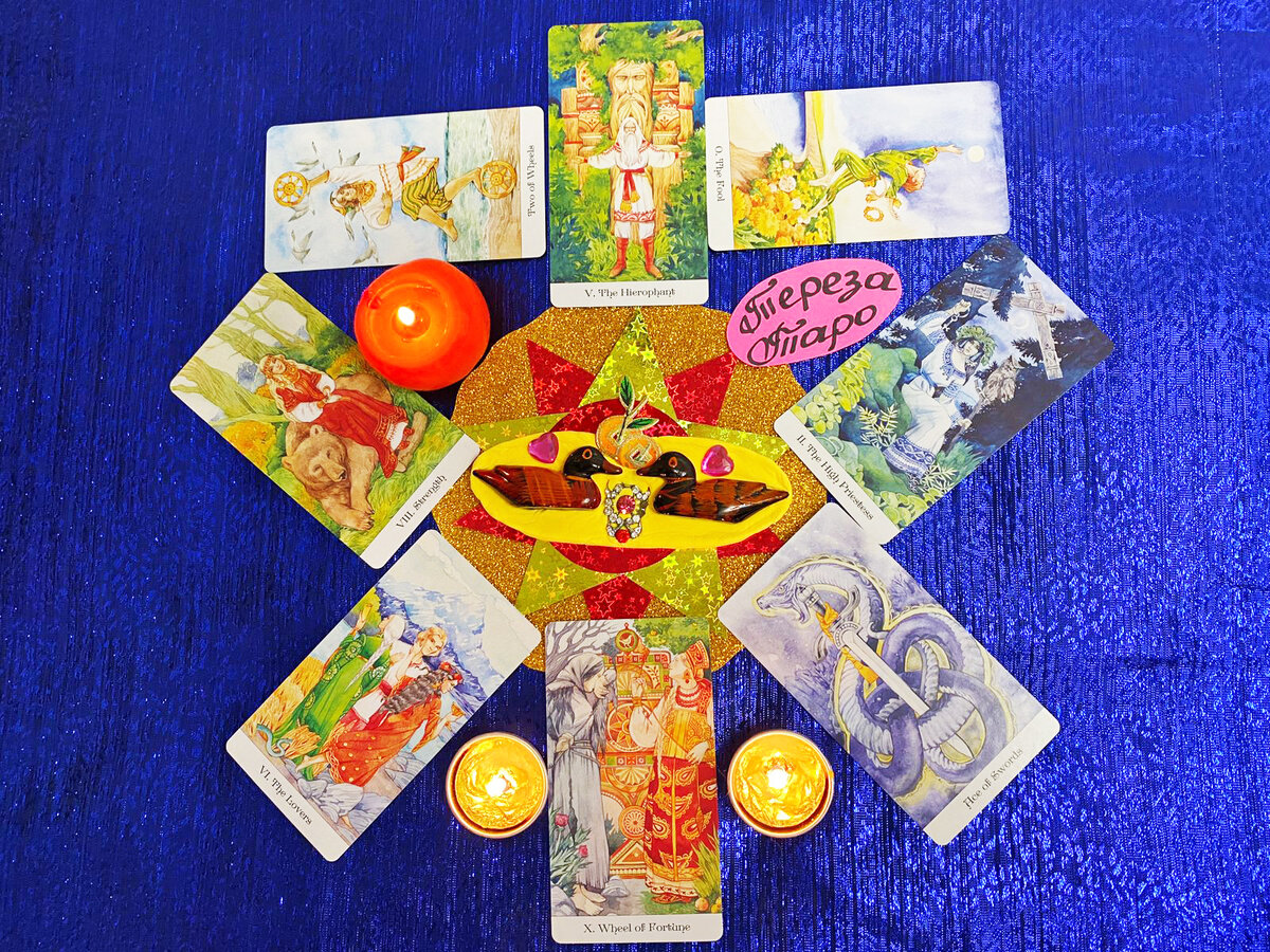 Карты выпали такие: Шут, Сила, Туз мечей, Иерофант, Влюбленные, Верховная Жрица, 2 пентаклей, Колесо Фортуны.