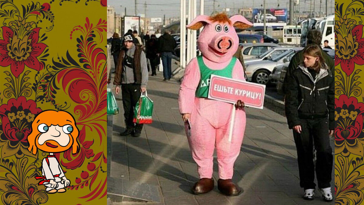 Привет, дорогой друг! Новый выпуск вашей любимой рубрики «Чисто по-русски». Здесь я коллекционирую фотографии, которые показывают остроту ума наших сограждан. Запрягаем коней и вперед! Только русский аниматор способен создать когнитивный диссонанс. Студент-первокурсник в костюме свиньи призывает прохожих есть курицу. Ну где еще такое возможно увидеть? Русский человек всегда придумает как отдохнуть. Нет возможности уехать загород, нет возможности ходить в солярий. Зато есть балкон, зонт и базовое техническое образование. Благодаря трем последним составляющим, у мужчины получилось создать подобие южного отдыха. Только российский пользователь ПК может создать рабочее место, где угодно. Отсутствие рабочего стола не является проблемой, когда дома есть двухкамерный холодильник. Раз его пропорции идеально подходят для монитора, системника и клавиатуры, то почему бы этим не воспользоваться? Русский автолюбитель всегда подумает о собаке. Как же важно сделать в багажнике отверстие под диаметр го