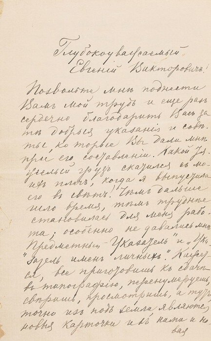 «Глубокоуважаемый Евгений Викторович! Позвольте мне поднести Вам мой труд и еще раз сердечно благодарить Вас за те добрые указания и советы, которые Вы дали мне при его составлении. Какой тяжелый груз скатился с моих плеч, когда я выпустила его в свет! Чем дальше шло время, тем труднее становилась для меня работа; особенно не давались мне „Предметный указатель“ и „Указатель имен личных“. Кажется, все приготовишь к сдаче в типографию, перенумеруешь, сверишь, просмотришь, а тут точно из под земля являются новые карточки и с ними новая работа. И другая у меня радость: закончила юбилейное издание П.С. Сочинений, издала все 14 томов и том первый одновременно с сим присылаю Вам. Очень интересно было бы знать Ваше мнение о биографическом очерке С.Н. Булгакова. Скажите мне его откровенно. Мой „Музей“ я решила поднести Вам лично (...) Если заглянете ко мне, то очень обрадуете искренно Вас почитающую и преданную АДостоевскую. 1906 23 дек. Мой сердечный привет Вашей жене». Адресат письма — Евгени