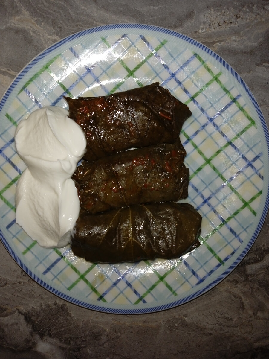 Долма - это блюдо, похожее на наши голубцы, только, вместо капустных листьев, используются виноградные листья. Фарш обычно бараний или говяжий. Но, сколько хозяек, столько и рецептов, поэтому готовим местную вариацию этого блюда. Виноград у меня растет, правда "Изабелла", а не один из сортов белого винограда, как рекомендуют в классическом рецепте. Из десятка рецептов, найденных в интернете, только в одном использовали листья белого винограда, хотя в описании у всех были листья белого винограда. Так что, готовлю из тех продуктов, которые есть в холодильнике и на огороде. Ингредиенты: виноградные листья 50 шт.; фарш свинина +индейка 1кг.; лук репчатый 2 шт.; свежая зелень (петрушка, укроп, кинза, тархун, зеленый лук) - чем больше, тем лучше; рис полстакана; специи (зира, смесь перцев молотая, красный перец); сливочное масло 100 гр.; домашний томат 1 стакан. Молодые листья винограда размером с ладонь вымыть, удалить ножки и залить кипятком на 5 -10 минут. Откинуть на дуршлаг. Зелень ме