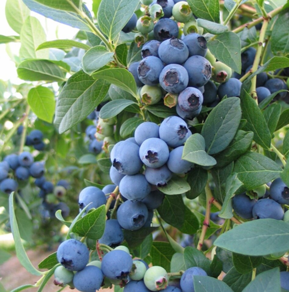 Блюкроп это сорт голубики, который несмотря на солидные годы даёт фору молодым амбициозным новинкам. Многие фермеры по всему миру до сих пор высаживают его сотнями акров и гектаров, предпочитая проверенную классику и не поддаваясь рекламным уловкам селекционных компаний, выбрасывающим на рынок всё новые, но не всегда стоящие сорта. А чем заслужил Блюкроп такую любовь, признание и доверие – в нашей статье ниже. История создания Наш герой был получен в США в результате скрещивания номерных разновидностей голубики GM-37 (Jersey x Pioneer) x CU-5 (Stanley x June) в далёком 1934-ом году. Работы проводились группой американских селекционеров в составе: J. Darrow, J. Clark, F. Coville, O. Freeman. Семена, полученные от скрещивания, высаживались на экспериментальном участке для последующего наблюдения. Затем в 1941-ом году учёные J. Darrow и J. Clark провели отбор по нужным характеристикам из более чем тысячи сеянцев. Новый сорт получил название Bluecrop и в массовую продажу поступил только в 1952-ом году. В переводе с английского Blue – синий, Crop- с/х культура, урожай. Описание Голубика высокорослая Блюкроп (Bluecrop) — одна из самых урожайных, устойчивых, самых известных, любимых и распространённых разновидностей в мире. Причём чтобы вы не запутывались, Блукроп и Блюкроп – одно и тоже, разница лишь в переводе названия на русский язык. Разновидность среднеспелая, созревает на юге с конца июня, в других регионах с начала июля. Пригодна для ручного и механизированного сбора. Наш герой – самый распространённый промышленный сорт в США, да и во всём мире. Растение с хорошей силой роста, куст высокий, стебли крепкие, упругие, прямостоячие, но немного раскидистые. Высота в основном 1,3-2 метра. Ширина 1-1,7 метра. Максимально растение вырастает до 2,5 метров. Куст значительно расширяется кверху по мере роста. Боковые побеги сильно ветвятся и загущаются. Поэтому требуется регулярная обрезка стеблей и вырезка тонких слабых веточек, отрицательно влияющих на будущий урожай и размер ягод. Корневая система голубики мочковатая, густоразветвлённая, не имеющая всасывающих волосков. В грунт проникает на глубину 30-40 см. Блюкропу для успешного роста и раскрытия всего заложенного в нём потенциала требуется соблюдение необходимого уровня кислотности грунта – pН 4,5 и ниже. Листья у сорта тёмно-зелёные с глянцевым блеском, плотные и гладкие, овально-продолговатой формы с цельными краями, заострённые на конце. Черешки короткие. Весной молодая листва может быть ярко-зелёного, салатового цвета. Поэтому часто это может пугать садоводов, легко можно спутать этот признак с хлорозом, при котором у растений листья примерно такого же окраса. Блюкроп удачно использовать в ландшафтном дизайне для украшения участка – листва осенью окрашивается в алый и желто-красный цвета. Плюс, побеги осенью приобретают красно-коричневый оттенок, что добавляет ещё больше декоративности всему растению. Время цветения этой голубики – поздно в мае или рано в июне. Причём растение с успехом выдерживает весенние заморозки. Цветы многочисленные, белые и бледно-розовые, в среднем 1 см в длину, колокольчатой формы с загнутыми назад 4-5 зубчатыми лепестками. Цветки собраны в красивые, длинные, свисающие вниз из-под веток кисти. Блюкроп – самоопыляемая разновидность. Но рекомендуется для повышения количества завязи, а следовательно урожайности и качества