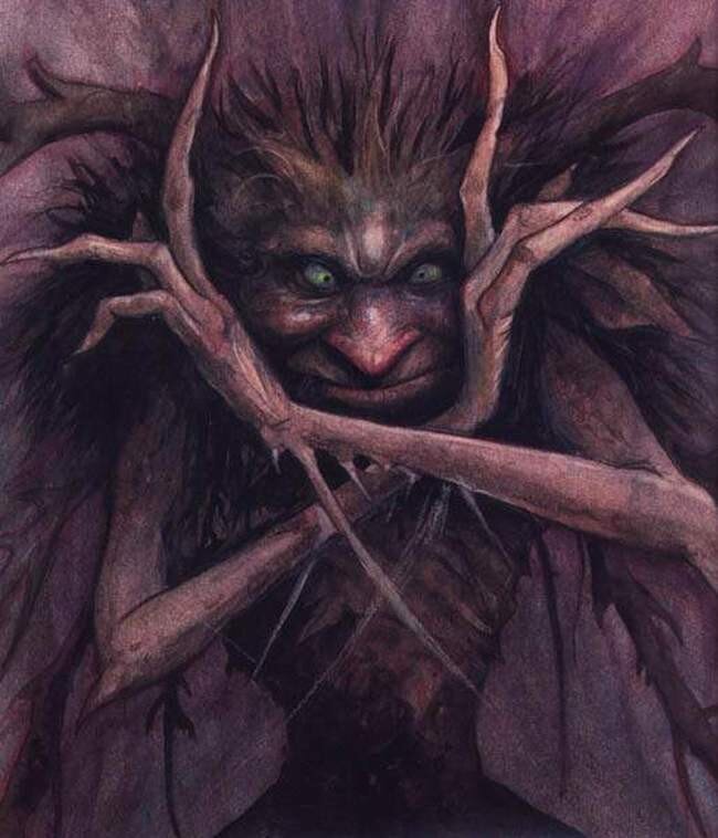 Анчутка – маленький злой дух. Рост анчуток составляет всего несколько сантиметров, их тела покрыты шерстью и имеют черную окраску, а головы у этих злых духов лысые. Характерной особенностью анчутки является отсутствие пяток. Считается, что нельзя произносить вслух название этого злого духа, так как анчутка сразу же на него откликнется и окажется прямо перед тем, кто произнес. Обитать анчутка может почти везде: чаще всего духа можно встретить в поле, в бане или на водоеме, так же он предпочитает селиться поближе к людям, но избегает встреч с более сильными существами. Впрочем, различная среда обитания накладывает особенности на внешний вид и поведение злых духов, так можно выделить три основных подвида анчуток: банные, полевые, водяные или болотные. Полевые анчутки самые мирные, не являются людям, если те сами не позвали их. Банные и болотные анчутки любят попроказничать, но шутки у них злые и опасные, нередко приводящие к смерти человека, так болотный анчутка может схватить пловца за н