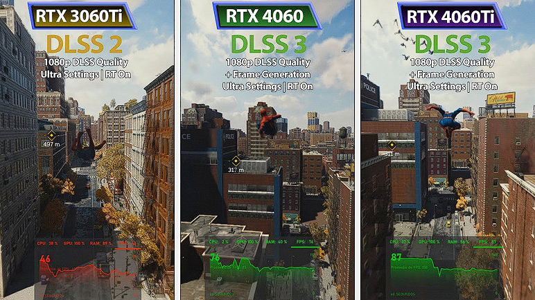 RTX 3060 Ti превосходит RTX 4060 в обычном режиме, но заметно отстает с DLSS 3.0