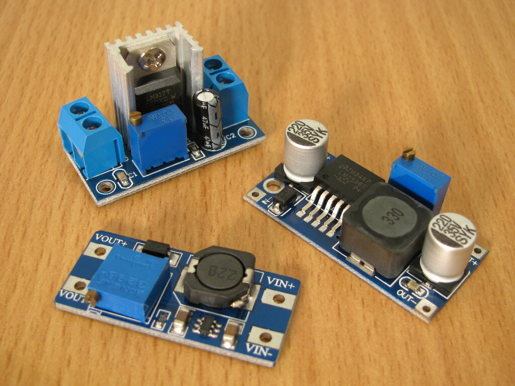 В домашних запасах нашлась пара модулей линейного понижающего стабилизатора напряжения на микросхеме LM317T. Покупал их несколько лет назад и теперь уже точно не помню где.
