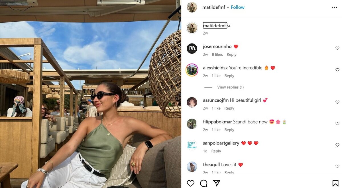 Тренер «Ромы» Жозе Моуринью прокомментировал пост своей дочери Матильды в социальных сетях. Девушка опубликовала свою фотографию в зеленом топе и белых брюках, которая стала быстро набирать лайки. Легендарный тренер в качестве комментария оставил смайлик в виде сердца под постом. Матильда Моуринью может и является дочерью знаменитого португальца, но она сама делает себе имя, основав MATILDE Jewellery, экологически чистый бренд ювелирных украшений, который был запущен в декабре 2020 года. Бренд 27-летней девушки даже получил награду Professional Jeweller Awards в номинации «Новый бренд года». Бренд Матильды выпускает и украшения не только для женщин, но и для мужчин, которые с гордостью носит ее любящий отец. Помимо Матильды, у Жозе Моуринью есть сын Жозе Марио Моуринью-младший. Жозе-младший ранее был вратарем в молодежной команде клуба «Фулхэм».