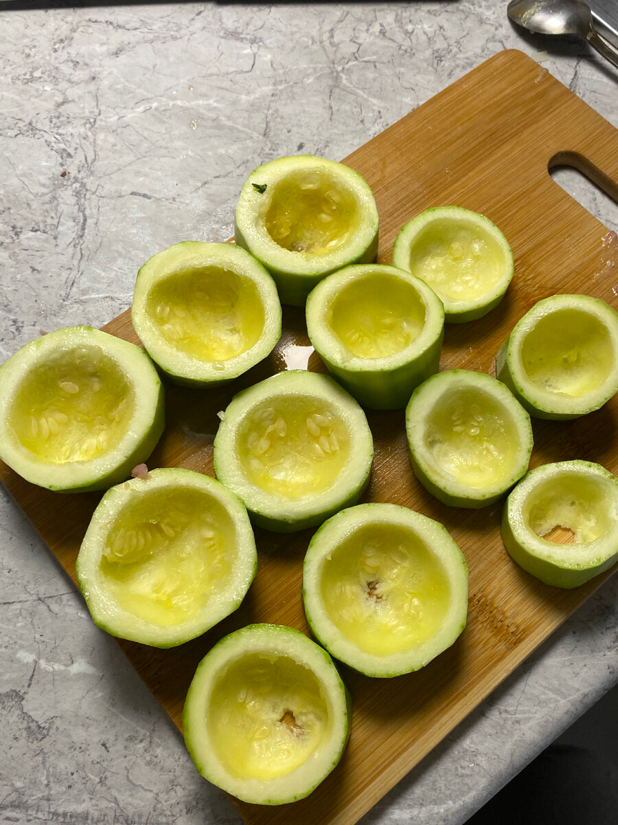 Ингредиенты: - 2 кабачка среднего размера - 250 г фарша (говяжего, свиного или смеси) - 1 луковица, мелко нарезанная - 2 зубчика чеснока, измельченных - 2 помидора, нарезанных кружочками - 100 г твердого сыра, натертого - Соль и перец по вкусу - Приправы по вкусу (например, итальянская смесь специй) Инструкции: 1. Предварительно нагрейте духовку до 180 градусов. Подготовьте противень, смазав его маслом или покрыв его бумагой для выпечки. 2. Нарежьте кабачки толстые (~2-3см) кружочки, затем аккуратно вырежьте часть мякоти, чтобы получить углубление для начинки. 3. Добавьте в фарш мелко нарезанный лук, специи по вкусу, я еще добавляю зелень- кинзу, она придает особый вкус. Все перемешайте. 5. Наполните углубления в кабачках приготовленной начинкой, выровняв края. Выложите их на противень. 6. На фарш выложите помидоры. 7.Посыпьте кабачки натертым сыром. 7. Поставьте противень с кабачками в разогретую духовку и запекайте около 25 минут, или пока кабачки не станут мягкими, а сыр