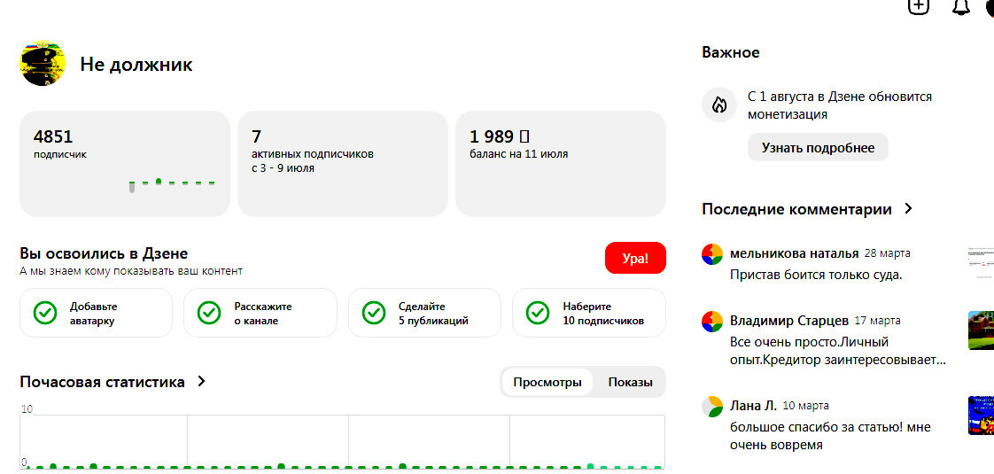 Оказывается, прошло почти полгода, как я перестал публиковать статьи. Связано это не с тем, что я разочаровался в площадке Дзена, а с определенными личными обстоятельствами, в связи с которыми я не могу пока публиковать статьи на данном канале. Несмотря на отсутствие новых публикаций, посещения этого канала не сократились до ноля, хотя они, конечно, носят индивидуальный и эпизодический характер. За время моего «безделья» монетизация на канале принесла почти 2 тыс. рублей. Вчера прочитал о введении Дзеном с августа текущего года новых правил монетизации каналов. В связи с этим появилась мысль проверить, случайно ли я вышел на монетизацию на этом канале или мой контент реально вызывает определенный интерес. Публикация близкой тематики будет продолжена на канале moscalzone Буду рад видеть там своих подписчиков. А пока публикую на нем: свои впечатления от работы судебных приставов по ОУПДС соседнего отдела в здании районного суда случай очередного нарушения законодательства сотрудниками ФС