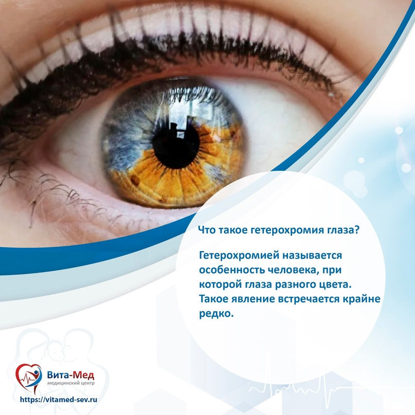 Гетерохромией называется особенность человека, при которой глаза разного цвета. Такое явление встречается крайне редко. Согласно статистике, из 1000 человек только 5 посчастливилось стать обладателями разноцветных глаз. Цвет органа зрения зависит от количества меланина в радужной оболочке. У голубоглазых определяют низкое содержание этого компонента, а у кареглазых – высокое. Когда происходит неравномерное распределение меланина между левой и правой радужками, то глаза приобретают разный оттенок. В зависимости от степени окрашивания радужной оболочки различают: Единый номер телефона для записи: +7 (978) 256-00-01 ❤️С заботой о Вашем здоровье, Вита-Мед