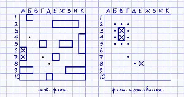 Прелесть таких игр в том, что для них не нужно никаких дополнительных предметов: только лист в клетку и пара ручек. Уверен, многие играли в эти игры на уроках. Научите играть в них своих детей — это и интересно, и весело, и полезно для развития логики и пространственного мышления. Морской бой Игнорировать эту игру было бы преступлением. Думаю, правила знают все, так что напомню вкратца: два поля 10х10, 10 кораблей (1 четырехпалубный, 2 трехпалубных, 3 двухпалубных и 1 однопалубный) и необходимость “утопить” флот противника. Ходят игроки по очереди, но при удачном выстреле получаешь дополнительную попытку. И вплотную корабли ставить нельзя, между ними должна быть хотя бы одна клетка. Точки Понадобятся ручки/карандаши/фломастеры двух цветов. У каждого соперника цвет свой. Цель: захватить как можно большую площадь листа. Для этого игроки по очереди ставят точки на пересечении клеток. Территория становится вашей, когда она обнесена точками “вашего” цвета полностью, и можно соединить точки,