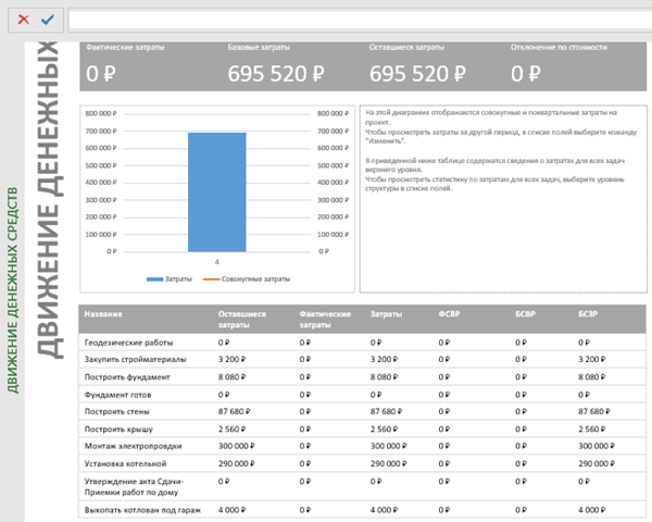 В данном примере рассмотрена ситуация в проекте, когда проект разработан, план работ проекта согласован утвержден и сохранен как базовый. Но задачи проекта выполнятся еще не начаты, и соответственно, в таблице фактические затраты равны нулю.
