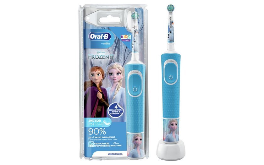 Лучшие электрические зубные щетки для детей достойны отдельной подборки — пока рассмотрим один яркий пример. Особенность Oral-B Vitality Kids — яркий дизайн: есть щетки с принцессами из «Холодного сердца», Человеком-пауком, героями мультфильма «Тачки» и другими персонажами. На высоте не только внешний вид — функциональность для ребенка тоже достаточная. Есть ежедневная и бережная чистка, таймер на 2 минуты, цветовая индикация износа щетинок и насадка, оптимальная для детских зубов. А чтобы ритуал ухода за полостью рта был еще интереснее, можно подключиться к приложению Disney Magic Timer.