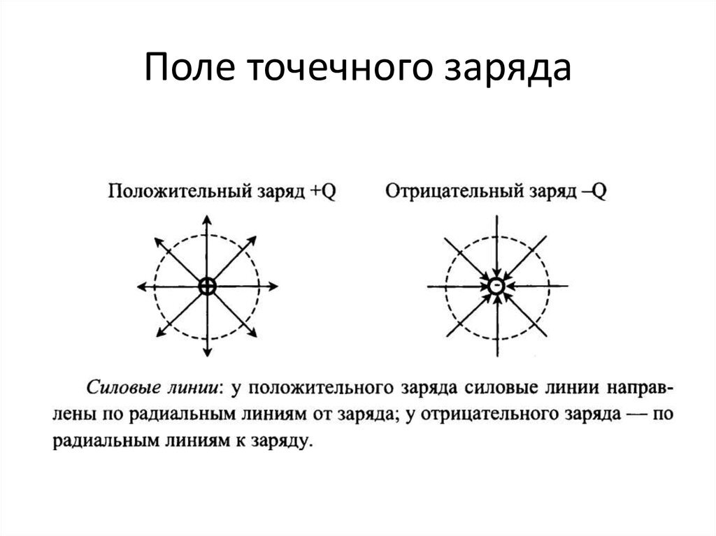Можно исследовать электрическое поле разных электрических зарядов с помощью пробного положительного заряда. Это значит пробный положительный заряд помещаться в разные области поля рядом с положительным и отрицательным зарядом и за его поведением наблюдают. В результате физики делают такие выводы. Оказывается что пробный положительный заряд будет двигаться по радиальным линиям — вблизи положительного заряда от него, вблизи отрицательного заряда — к нему.