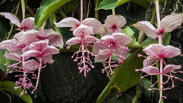Необычные висячие цветы живописного растения выделяются ярким цветовым пятном на фоне свежей зелени тропического леса. Бледно-розовые прицветные листья оттеняют аккуратные кисточки соцветий тоном темнее. В природе мединилла встречается в Африке и Азии, а также на одном тихоокеанском острове. Цена одного экземпляра колеблется от 50 до 150 долларов США.