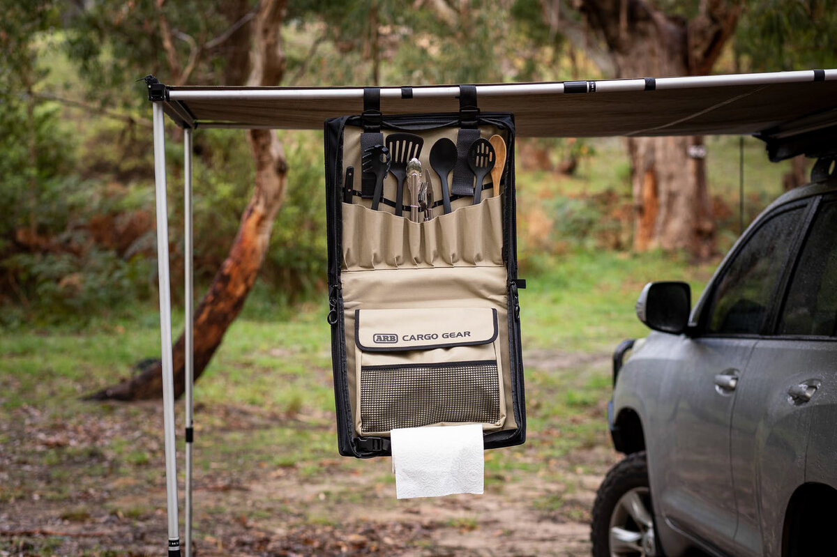 Органайзер ARB для кухонной утвари — прекрасный помощник на походной кухне. В нем предусмотрены кармашки для кухонных принадлежностей, внутреннее отделение, держатель для полотенец и внешний сетчатый карман. Необходимые мелочи на вашей походной кухне всегда будут под рукой. Органайзер сшит из прочной ткани PVC с вставками из неопрена. Специальные петли, липучки и отверстия позволяют закрепить органайзер в любом месте (например, на тенте ARB). Этот аксессуар просто необходим, если вы собираетесь готовить на природе. Характеристики: