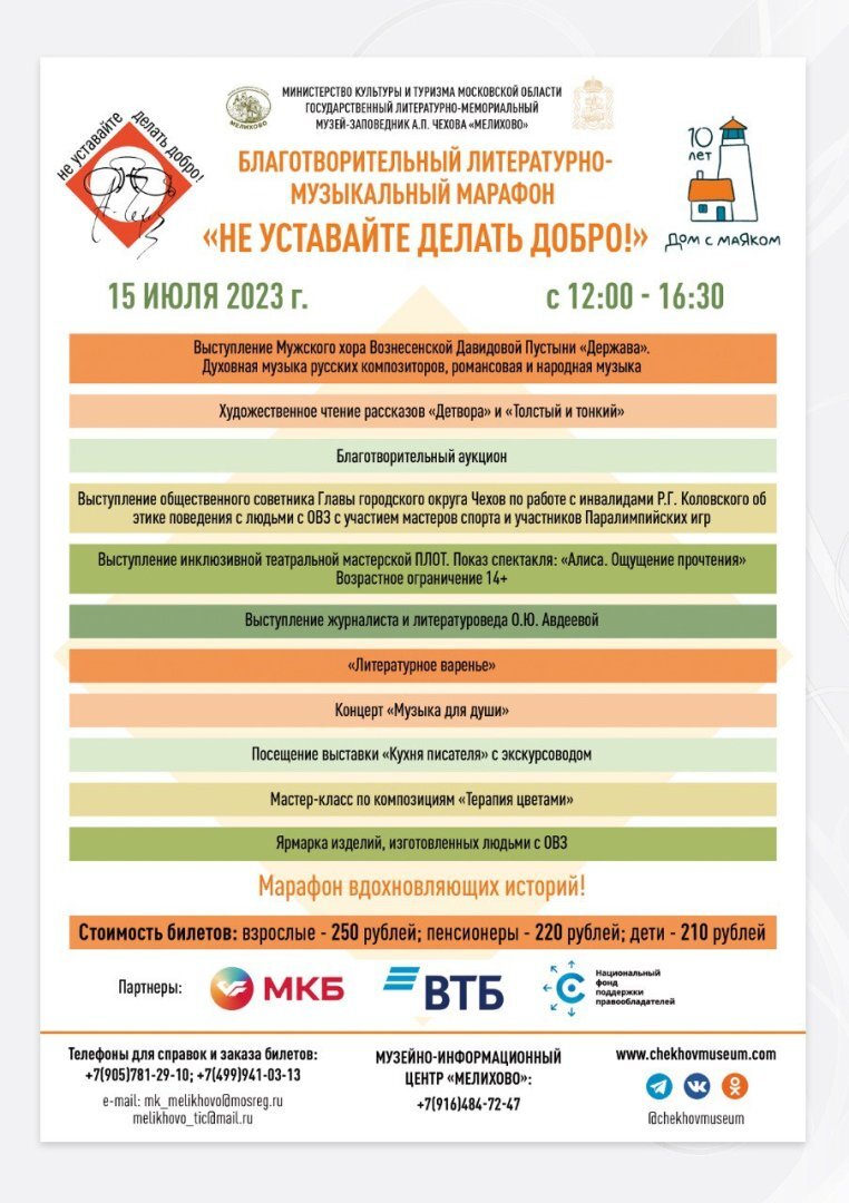 В третий раз проект «Литературное варенье» участвует в БЛАГОТВОРИТЕЛЬНОМ МАРАФОНЕ, который организует музей ЧЕХОВА «МЕЛИХОВО». Куда мы вас приглашаем. 15 июля в музее-заповеднике А.П. Чехова «Мелихово», в Чеховском районе Московской области пройдет благотворительный литературно-музыкальный марафон «Не уставайте делать добро!». Мероприятие проводится в День памяти Чехова. Всем известно, что Антон Павлович активно занимался благотворительностью, бесплатно лечил, боролся с эпидемией холеры, строил школы, сотнями отправлял книги для библиотек, попечительствовал, помогая учителям и ученикам. Благотворительный фонд «Дом с маяком» - оператор Марафона в 2023 года уже открыл сбор средств на помощь Ульяне Давыдовой. Любой желающий может внести свою лепту сейчас. https://mayak.help/news/otkryvaem-sbor-sredstv-dlya-d.. «Литературное варенье" вместе с театральной мастерской «Плот» и Мужским хором Вознесенской Давидовой Пустыни «Держава» будет гостем Мараф