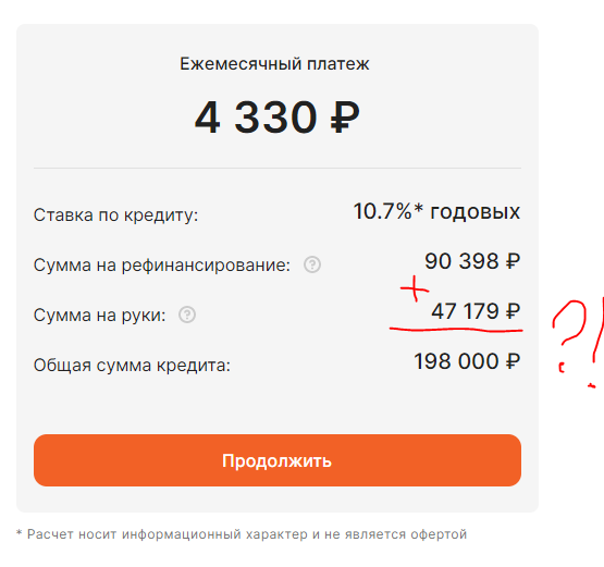 Просматривал почту, вдруг "заманчивое" предложение от ПСБ. Ну, не поленился, зашел. Вспомнил явки-пароли, нажал на супер предложение и вот. Изначально предлагали что-то типа 687000, да ещё с копейками. Но мне столько не надо, и как любят предлагать барышни в телефоне, "возьмите сейчас, а там придумаете что-нибудь", мне тоже не интересно. А вот рефинансировать старые долги под меньший процент - можно посмотреть. Хотя, я изначально был настроен скептически. Поэтому уменьшил сумму до минимума, и тут же вылез подвох. Как говорится, не подвела солдатская смекалка )) Может, в банки сейчас берут сплошь людей с "гуманитарным складом ума", то есть тех, кто не смог осилить математику и которых раньше называли кретинами? Все оказалось довольно просто. Банки сейчас предлагают некие "страховки" и даже "услуги по уменьшению процентов". Просто добавляют вам эти проценты сразу в тело кредита сразу за весь срок, а вы платите "уменьшенные" проценты со всей суммы. ХитрО! К чести ПСБ, при оформлении есть
