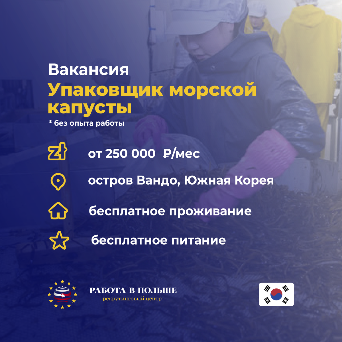 Что нужно будет делать? 💥 Упаковка и контроль качества морской капусты на заводе Какие условия? ✔️Город работы: остров Вандо ✔️Средний заработок в месяц от 250 тыс рублей ✔️Опыт работы и знание языка не требуются ✔️Отправка осуществляется еженедельно (в удобный для вас день) ✔️Срок пребывания в стране от 3-х месяцев до 2-ух лет; ✔️ Заключаем договор - вылет - встреча с работодателем; ✔️ Проживание и питание предоставляется ✔️ Условия отличные. Оформление и вылет в течении недели ✔️ Рабочий день 10-12 часов/ 5-6 дней ✔️ На протяжении всего вашего пребывания, мы и русскоязычный куратор на связи Какие требования? ❗️Заграничный паспорт Где жить? ☑️ Проживание и питание предоставляется ☑️ Проживание общежитие, квартира. Комнаты по 2 чел. Вода, стирка, тёплый пол, душ, туалет, wi-fi; ☑️ Для более подробной консультации обращаться по телефону или в офис нашей компании. ☑️ Оформим в кратчайшие сроки. Подберем подходящую вакансию. Работаем напрямую с работодателем, без лишних затрат! ❗️ВОЗМОЖН