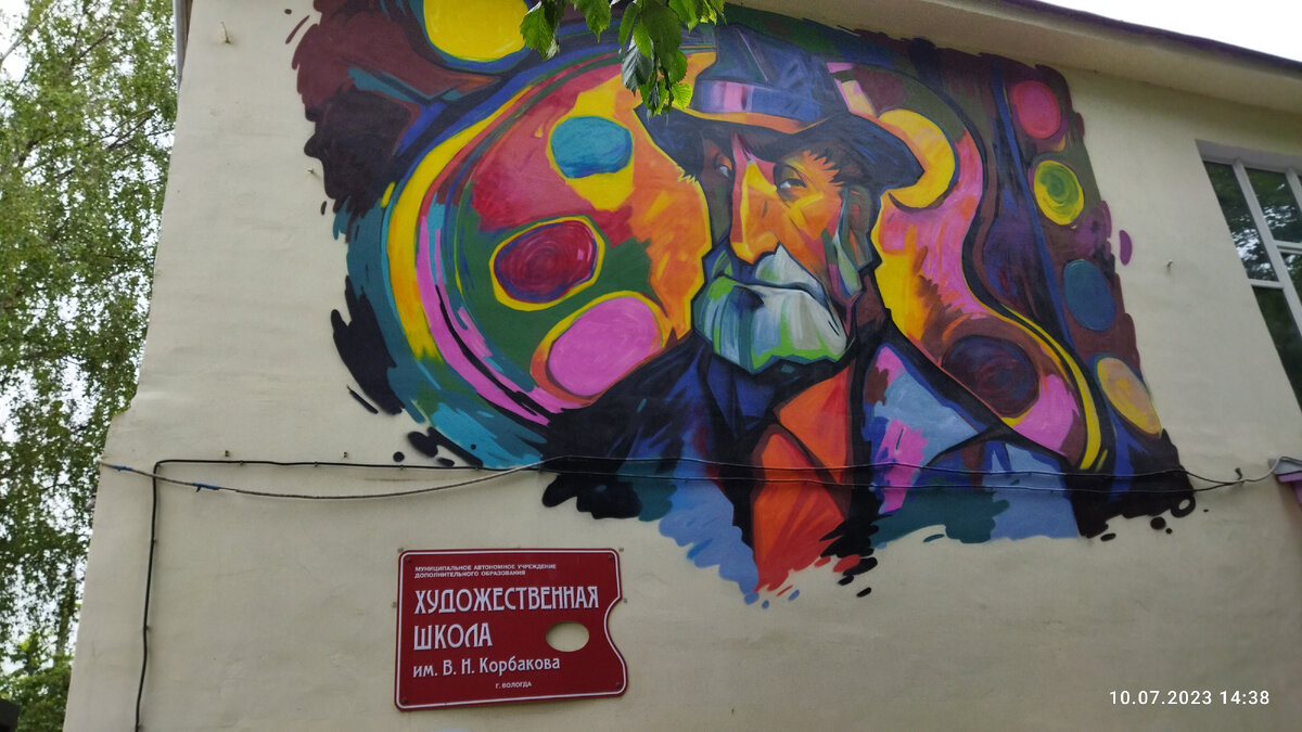 В каждом городе есть свои основные, популярные достопримечательности, информация о которых есть в каждом буклете или статье. Но есть то, что интересно увидеть, но не все об этом знают. Вот в этой статье я хочу рассказать об одной улице Вологды и граффити. Граффити и муралов в Вологде стало появляться все больше и больше. В прошлом году в Вологде прошел впервые фестиваль стрит-арта «Палисад». Граффити появилось тогда на трех жилых домах и других объектах. И вот в этом 2023 году в июне прошел новый фестиваль стрит-арта, на котором 20 талантливых уличных художников из разных городов России украсили 19 зданий. Я решила посмотреть некоторые муралы по адресам: бульвар Пирогова и ул. Герцена. А пошла по Советскому проспекту вдоль реки Вологды. Здесь находится здание художественной школы им. В. Корбакова (Советский пр., 54). К 100-летию вологодского художника Владимира Корбакова в 2022 году на фасаде школы появилось граффити с портретом художника. Создал его вологодский художник Олег Иванов. О