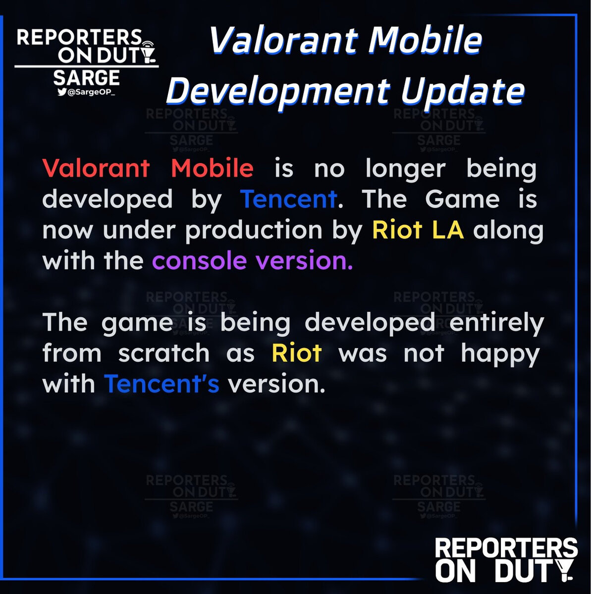 Уже очень долгое время от Riot Games и Tencent не поступало никакой информации о процессе разработки мобильного порта тактического шутера Valorant, и нескольким инсайдерам удалось узнать причину этого. Согласно пользователям твиттера ReportersOnDuty и SargeOP_ компания Tencent Games прекратила разработку Valorant Mobile. Теперь за производство порта взялось Лос-Анджелеское подразделение Riot, которое также занимается консольной версией шутера. При этом команда решила начать разработку мобильной игры "с нуля", так как им не понравилась версия от Tencent. Таким образом в ближайшее время ждать релиза Valorant Mobile явно не стоит. Один из инсайдеров считает, что выпуск мобильного шутера состоится в конце 2024 — начале 2025 года.