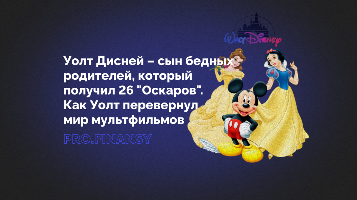 Уолт Дисней четвертый ребенок из в семье. Семья была небогатой и отец не был рад рождению ещё одного ребенка 5 декабря 1901 года. Мама была учительницей, а отец перепробовал много профессий: продавал апельсины, был плотник, искал золото. Но одна из профессий отца сыграла свою роль в семье. Эта профессия — фермер. Нет, богатства отцу она не принесла, но в будущем принесла достояние Уолту.