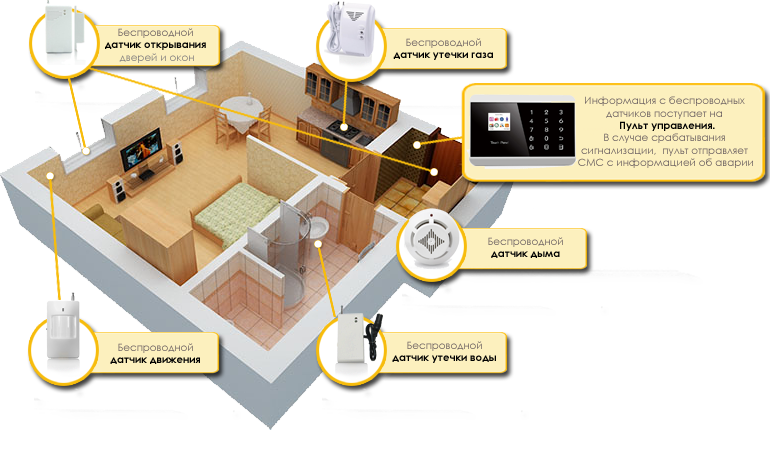 Пример: датчик движения в прихожей будет реагировать на вход гостей, которых не ждете или датчик открывания двери. Они на батарейках. Датчик открывания двери отличная и надежная вещь, его никак не обезвредишь, он автономен, а сам датчик может быть на межкомнатной двери, на окне и т.д.