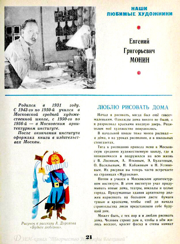 20 июля 1931 года родился Евгений Григорьевич Монин - художник, иллюстратор; проиллюстрировал более 200 детских книг, среди которых сказки братьев Гримм, Маршака, Корнея Чуковского, народные сказки Италии, Англии, Франции, Армении.