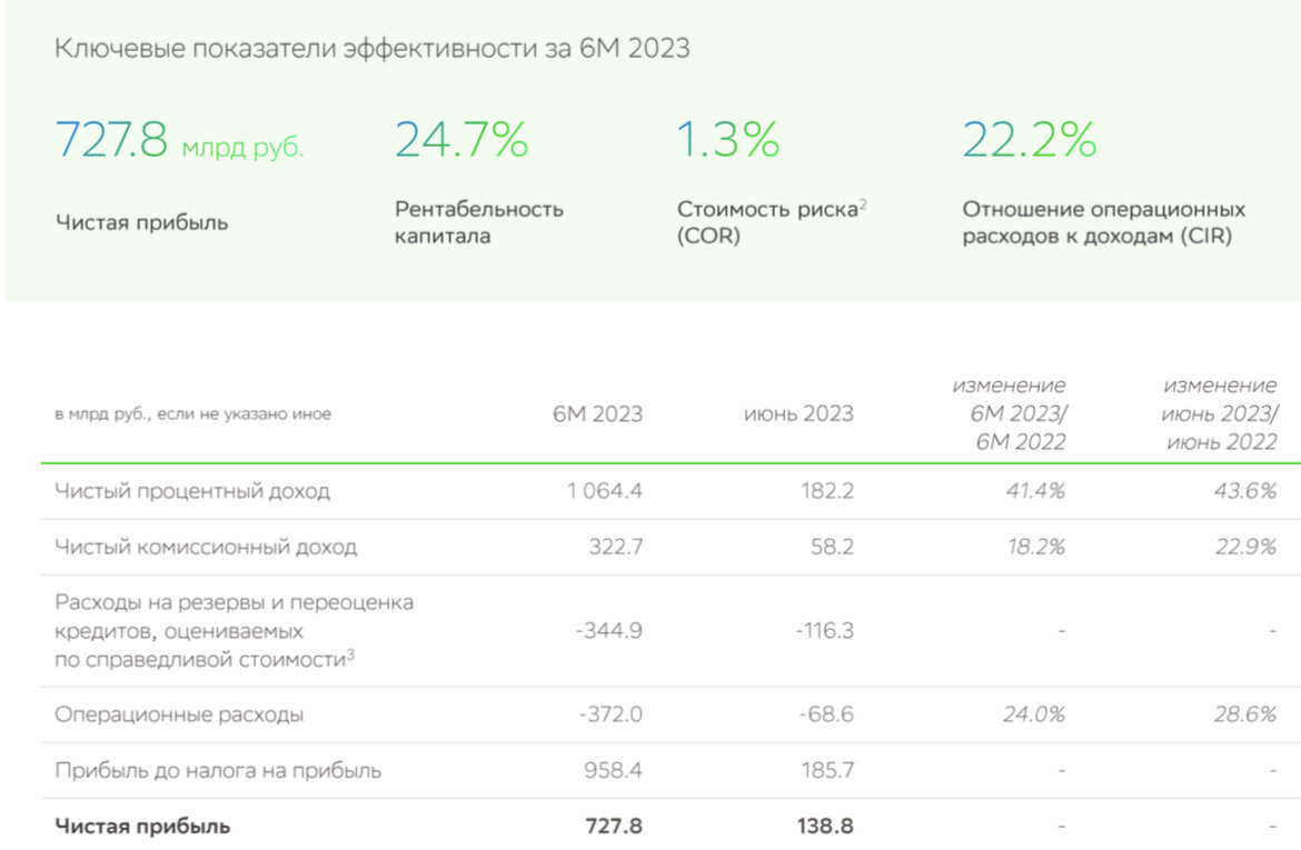 🏦 Компания опубликовала сокращённые результаты по РПБУ за 6 месяцев 2023 года. Сбербанк не собирается останавливаться на достигнутом и продолжает генерировать чистую прибыль свыше 100₽ млрд, всего же за 1П было заработано — 727,8₽ млрд (будущие дивиденды и вправду могут быть выше предыдущих). Компания отметила, что в июне частным клиентам было выдано кредитов почти на 720₽ млрд — максимальный уровень за всю историю Сбера (ключевым драйвером остаётся ипотека). Рост связан со стремлением банков успеть выдать кредиты по госпрограммам с низким первоначальным взносом до ужесточения подхода по применению макропруденциальных надбавок к таким кредитам с 01.06.2023 (первоначальный взнос заёмщика для неприменения надбавок должен составлять не менее 20% с 1 июня 2023 года, не менее 30% — с 1 января 2024 года). Также в июне Сбер закрыл сделку по продаже 100% акций дочерней компании в Австрии Sber Vermögensverwaltungs AG in Abwicklung (ранее Sberbank Europe AG). Данная сделка оказала существенное положительное влияние на финансовый результат банка, данную продажу и плюсы я освещал в недавнем посте на канале. Теперь давайте рассмотрим главные показатели из отчёта: