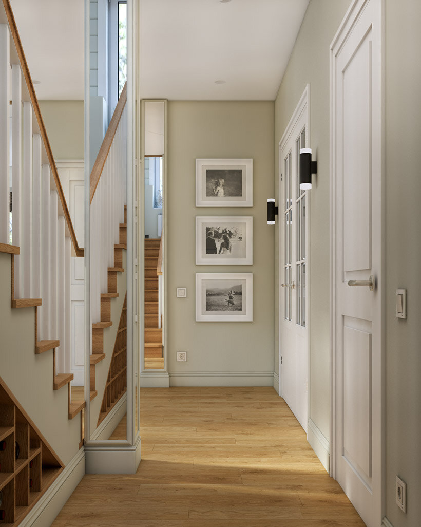 Комната гостиной в загородном доме, делится на диванную зону с телевизором и герметично встроенным в интерьер камином, и столовую зону, прилегающую к кухне. Видео: дизайн интерьера всего дома Пол из светлого дерева, белые стены и множество окон создают светлый интерьер. Зелёный цветовой акцент штор и обивки стульев придает природной атмосферы. Интерьеры кухни-гостиной от других дизайнеров: