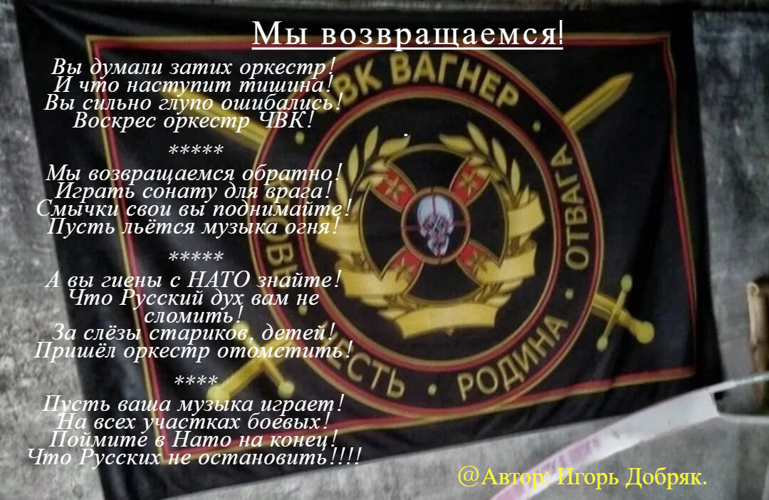 Дорогие друзья, я вас всех приветствую на этом канале ,,писатель Игорь Добряк ,,. Сегодня я написал красивое произведение в поддержку ребят ЧВК Вагнер. И хочу этим стихом донести до многих,что эти ребята , как ребята с МО РФ борятся за нашу свободу, за нашу Родину. И не надо оскорблять и унижать этих ребят! Они такие же простые люди из народа! Что было то было,пора забыть и идти вперёд! Скажу всем: Люди, будьте добрее! Зла и так на земле хватает! С уважением ко всем ваш Добряк 🧡!