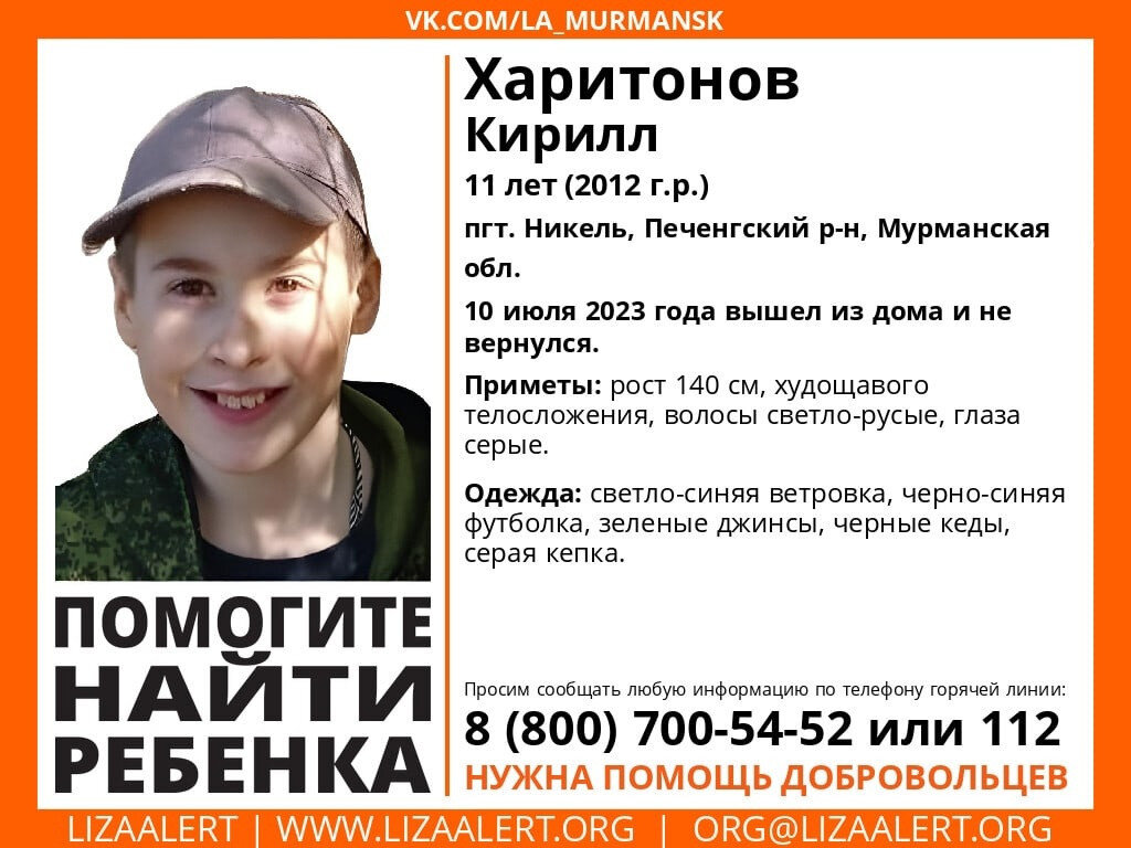 11-летний Харитонов Кирилл 10 июля ушел из дома, расположенном в пгт. Никель Печенгского района Мурманской области и до сих пор не вернулся обратно.