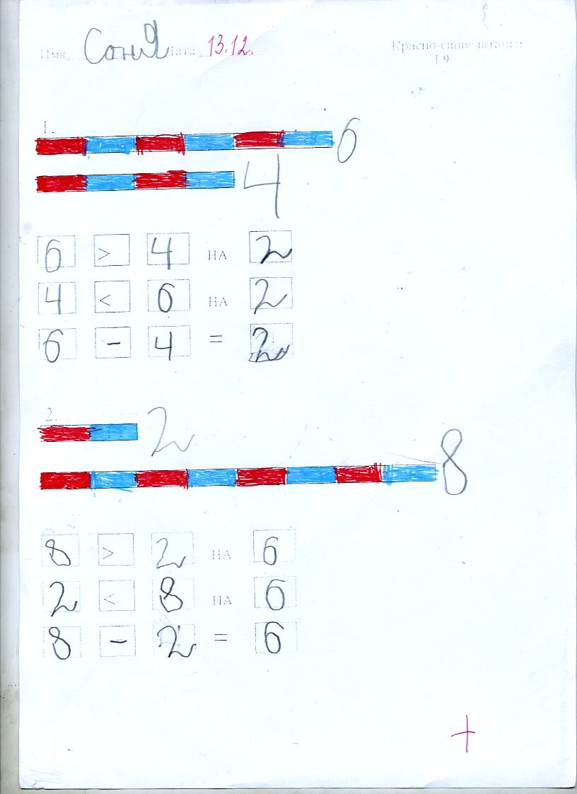 В какой последовательности это можно почитать: К чему все это подводится в конце концов: Чтобы посчитать на сколько одна штанга больше другой, надо левую ладошку положить слева на обе штанги, закрыв, допустим, если взять первый рисунок и первую пару, то четыре "отделения" у нижней и четыре у верхней (одинаковое количество), а правой посчитать сколько "отделений" осталось не закрытых и это и будет число "на сколько". Знак "больше-меньше" - это клювик у птенца. Птенец маленький, значит там меньше, а где клювик открыт, туда родители складывают еду и они большие, значит там больше. Про эту ассоциацию потом никто и не вспоминает, а знак ребенком запоминается и все эти сравнения укладываются в голове тоже, постепенно, без гонки. Всем Добра!