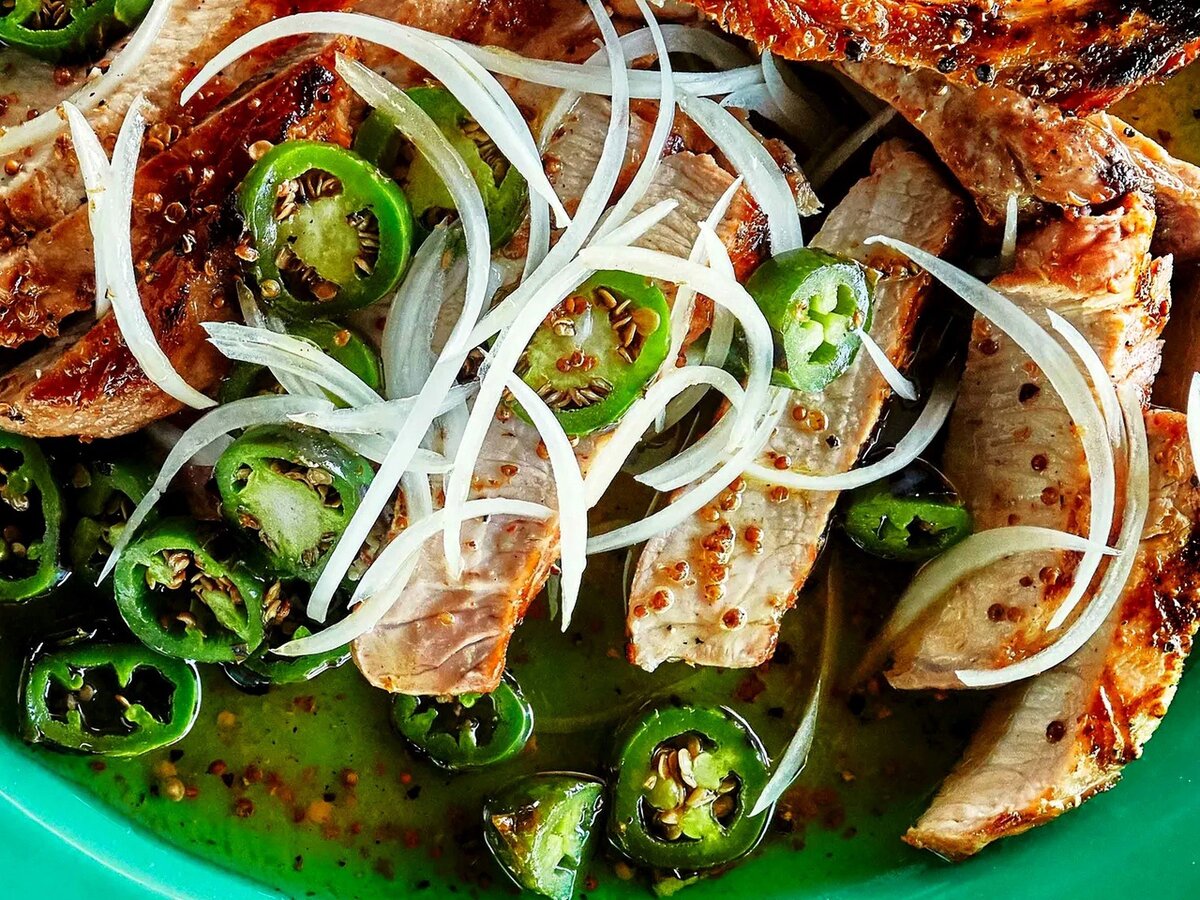 Ингредиенты/4 порции: ~ 1200 г ребрышек, 2 больших халапеньо, четверть средней белой луковицы, ½ чашки и 3 ст.л оливкового масла, 50 мл яблочного уксуса, 2 ч.л семян кориандра, 1 ч.л сахара, соль, перец.