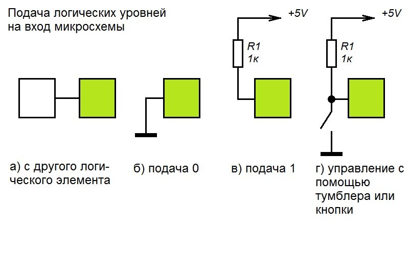 Сигнал на вход подается либо с другой микросхемы, либо следующим образом: логический 0 - заземлением входа. А если мы вход не подключим? - Тогда, померяв на нем напряжение, мы обнаружим промежуточный "серый" уровень около 1,5 В. Микросхема будет воспринимать его, как логическую единицу, но может легко переключиться от какой-нибудь помехи. Поэтому для надежной подачи логической единицы вход соединяют с питанием +5 В через резистор в 1-2 кОм.
