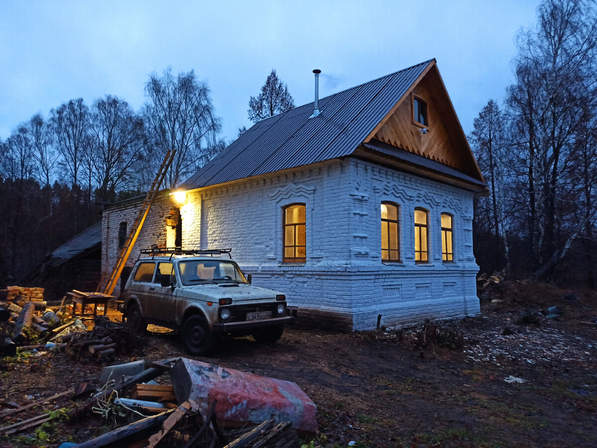 Здравствуйте, дорогие читатели «Вятского Хутора»! Открыл я тут у себя на компьютере папку с видео, которые выходили в 2021 году. Взгляд тут же зацепился за ролик, темой которого была первая ночёвка в восстанавливаемом доме. Тот 2021 год запомнился нам активными строительными работами. За лето мы вместе с папой, братом и друзьями накрыли новой крышей вековые стены, настелили полы и смонтировали потолок. Потом появилась печь, утеплился потолок. В конце октября я решил впервые переночевать в получившемся помещении. А что, всё есть для маломальского уюта: тепло, огонь в топке за стеклом и дымящийся крепкий чай в кружке. Пустая комната, старый стол у окон, в углу − небольшой «склад»: инструменты, строительные смеси, какие-то коробки с гвоздями. Нет ни штукатурки на стенах, ни зимних рам, ни электрической плиты. Всё это ещё где-то там, впереди. Но, как я помню, было очень уютно. Ведь вот-вот тут были одни гнилушки. За окном осень. Поздняя вятская осень с дождями и заморозками. Морось, лис
