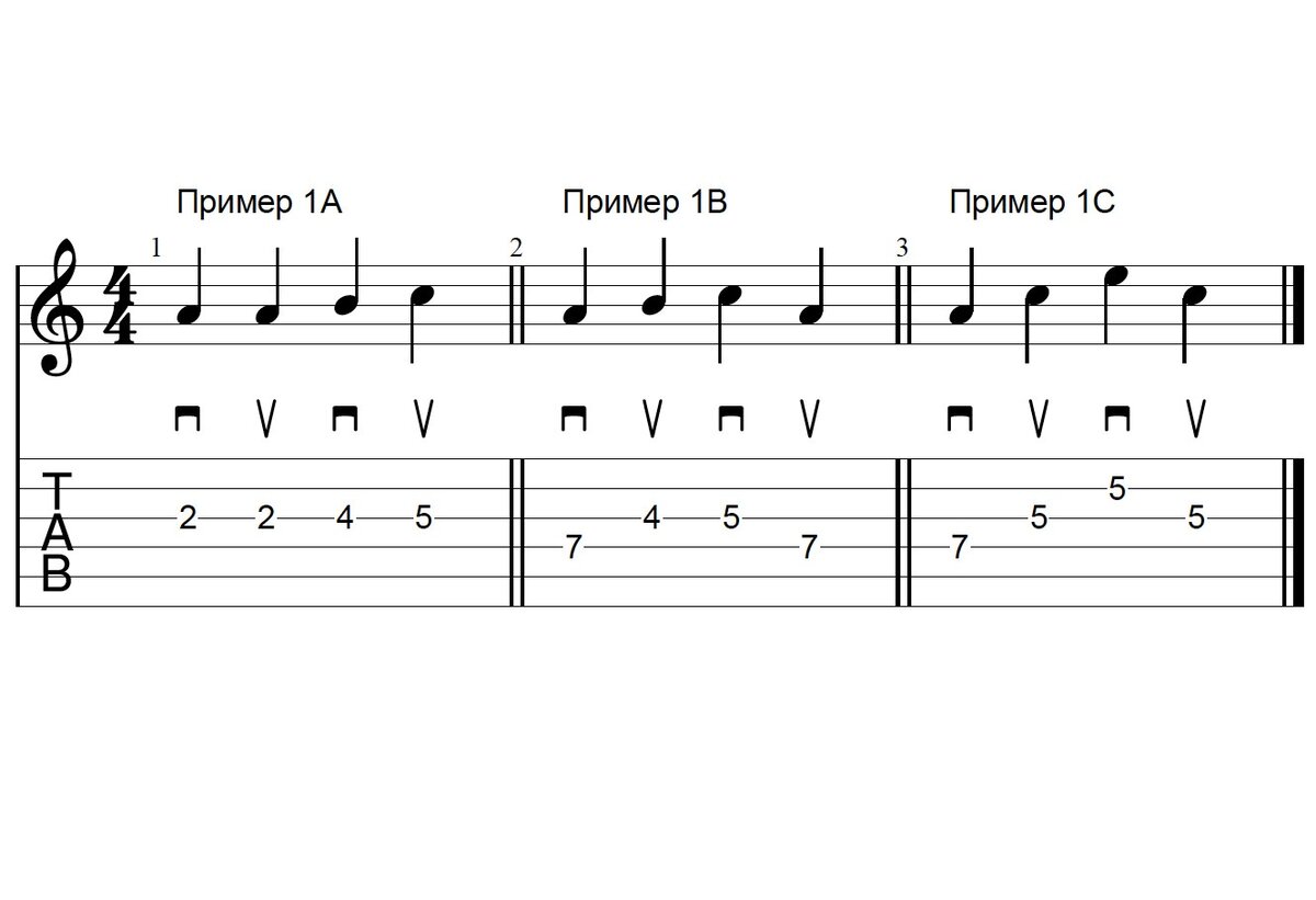 Штрихом называется способ извлечения звуков. Применительно к медиаторной технике штрихом называется то, или иное направление движения медиатора. Всего их два: удар вниз, который также часто называют английским термином - «даунстроук» (downstroke), и удар вверх или «апстроук» (upstroke). Переменным штрихом (alternate picking, ПШ) называется строгое чередование ударов медиатора вниз-вверх и т.д., либо вверх-вниз и т.д. Важно именно постоянное чередование ударов на каждую ноту. Пример 1a: 4 ноты на одной струне (в примере использовать 2 одинаковых ноты), Пример 1b: 4 ноты на 2 смежных струнах, Пример 1c: 4 ноты на 3 разных струнах. Это всё переменный штрих. Думаю, логика понятна: просто чередуем удары на каждую ноту, где бы она ни находилась. Существует и другой вид строго медиаторного штриха - «свип» (sweep) и его разновидность - «экономичный штрих» или «экономи-пикин» (economy picking). Об этих разновидностях мы поговорим в других статьях. Выбор штриха всегда обусловлен технической зада