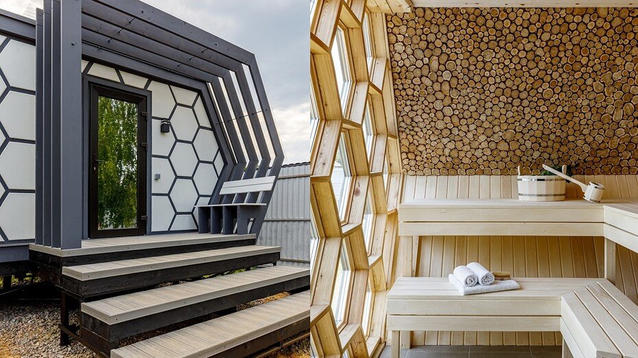Необычная архитектура выделяет этот домик, а внутри есть все необходимое для комфортного отдыха. Фото: Андрей Машкин Заказчики и задачи Хозяева, семейная пара средних лет, решили, что хотят сделать на своем участке баню с парной, зоной отдыха, кухней, душевой и туалетом. Нашлось необычное, но удобное и современное решение — модульный дом — разработка студии Алексея Стрелюка AS-House. Алексей также владеет студией дизайна ASDesign, поэтому заказчики получили работу, что называется, «под ключ». Дом и планировка Дом выглядит футуристично. Представляет собой вытянутый шестиугольник с фасадами с такой же шестигранной расстекловкой. Домик установлен на сваях. На крыльцо можно подняться по ступенькам. Здесь, как и хотели заказчики, оформлено место отдыха под навесом. Крыльцо огорожено рейками, но сверху накрыто прозрачным профилированным поликарбонатом, защищающим от осадков. Планировку разрабатывали с нуля. При входе — кухня с зоной отдыха. Дальше по коридору — санузел (изолированный) и душе