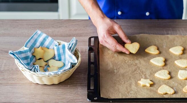 Ингредиенты: Яйцо куриное 2 шт. Мука пшеничная 400 гр. Масло сливочное 150 гр. Сахар-песок 80 гр. Разрыхлитель 1 ч.л. Соль 1 щепотка Время приготовления: 75 мин. Шаги приготовления 1. Как приготовить вкусное песочное печенье в домашних условиях? Возьмите свежее сливочное масло и нарежьте его кубиками при помощи острого ножа. Отложите масло в удобную емкость и уберите его в сторону, чтобы оно подтаяло. На это вам понадобится около получаса. 2. Затем начните взбивать яйца и сахарный песок. Взбивать нужно до образования пышной пены, далее постепенно начните добавлять кубики подтаявшего сливочного масла и продолжайте взбивать. 3. Соедините муку с солью и разрыхлителем, перемешайте. 4. Затем начните просеивать мучную смесь при помощи сита в миску с основой для теста. Смесь тщательно, но не очень долго, вымешивайте при помощи специальной насадки на миксер в виде крюка. 5. Из получившегося теста сформируйте шар и оберните его пищевой пленкой. Если тесто прилипает к рукам, добавьте еще нем