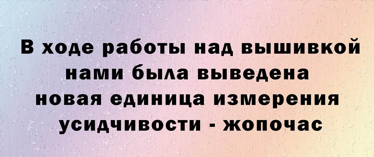 - Её подруги на игле сидели... - Зарплату проще измерять в наборах... - Мне волосы покрасте... в 310.... -И пуговицы крестиком пришиты.... - Больничный - это повод для картины.... - На распродажу? Да хоть с переломом!!!.... - Забытая игла нашлась по звуку... - Как сложно если просят синих ниток.... - Любой узор из клеток - это схема.... - А на последний крест не хватит нитки.... - Потерянная нить была последней.... - Вы ночью шили?! По глазам заметно!..... - Красиво шить не запретишь..... - Наборы дорогие.... Вышивка бесценна!!!!! - Хирург был вышивальщиком... И это было видно.... - Пришейте доктор, два десятка рук!.... - Канвы и ниток много не бывает!.... - Зачем полезла я на сайт закупок?..... - В продаже новое, так-так... Прощай зарплата!.... - Зарплаты на хочушки не хватает.... - Не трогай шкаф!!!! Блин... Всё повыпадало..... - Муж стер все схемы? Всё!!!!! Развод и к маме!!!!! - На выставку? Хоть чучелом, хоть тушкой!!!!! - Заприте меня на ночь в магазине