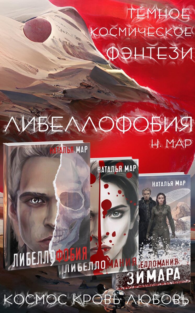 #Космоопера #Жестокость/Травмы #Любовь/Ненависть #Приключения #Темное фэнтези #Насекомые-вампиры Серия: Кайнорт Бритц 1. Либеллофобия 2. Либелломания 3. Либелломания: Зимара Всем привет! Перед вами одна из лучших современных российских фантастических серий от писателя Натальи Мар! В этих книгах есть: 1. Параллельные космические миры: Действие происходит одновременно на нескольких планетах. 2. Писательские инопланетные расы, среди которых люди, биороботы, человекоподобные существа-трансформеры, умеющие превращаться в тот или иной вид хищных пауков, стрекоз, ос, пчел и прочих существ, обладающих магией. Одни из них питаются себе подобными, другие пьют кровь и т.д. 3. Жестокие войны за обладание планетами, ресурсами и друг другом. Да, не смотря на развитые технологии в этих мирах существует рабство, где одни обеспечивают и питают других. 4. Невероятные по силе и притягательности характеры главных героев. Жестокое насекомое способно превращаться в обаятельного и притягательного эзера Кайн