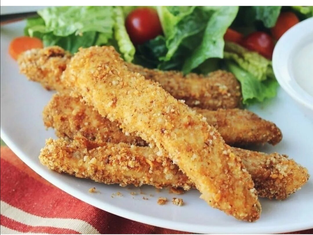 (на 100грамм - 131.98 ккал🔸Б/Ж/У - 21.28/4.45/0.09) Нам понадобится : 🔸400 г куриного филе 🔸1 яйцо 🔸Оливковое масло 🔸Панировачные сухари 🔸Соль, перец по вкусу Приготовление: Куриное филе порезать брусочками. Яйцо взбить со щепоткой соли и добавить к нему филе. Перемешать, накрыть пленкой и поставить в холодильник на 20 минут. Перед тем как начать жарить добавить перец, обмануть в панировачных сухарях. Жарить на хорошо разогретой сковороде, смазанной каплей масла. Подавать с салатом из свежих овощей.