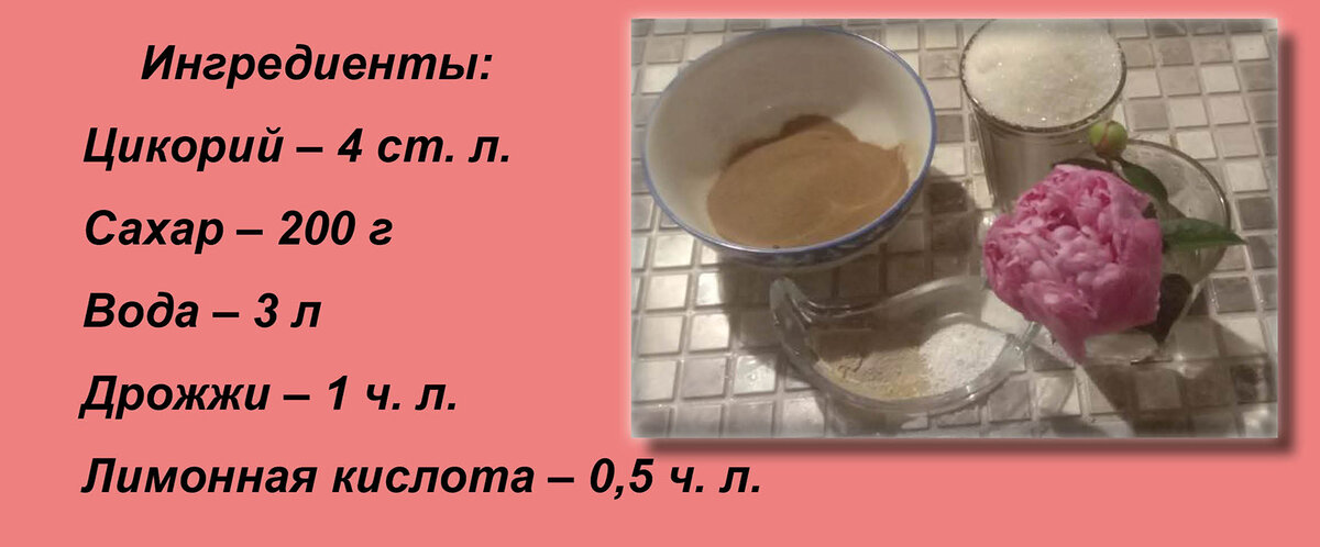 Рецепт ориентирован на растворимый цикорий. Вода должна быть тёплой, очищенной или кипяченой. 1 шаг. В 3-х литровую банку (лучше взять банку с закручивающейся крышкой) высыпаю цикорий, сахар, лимонную кислоту, дрожжи. 2 шаг. Вливаю к сухим ингредиентам 2 стакана воды, взятые из общего количества. Хорошо перемешиваю и оставляю до появления пены (примерно 10–30 минут, зависит от качества дрожжей). 3 шаг. После образования пены выливаю остальную воду, хорошо перемешиваю, накрываю марлей или полотенцем и оставляю на 6 часов. 4 шаг. По прошествии 6 часов плотно закрываю банку закручивающейся или капроновой крышкой и отправляю в холодильник минимум на 8 часов. Попробуйте обязательно – получается приятный, в меру сладкий и газированный напиток. ПРИЯТНОГО АППЕТИТА!!!
