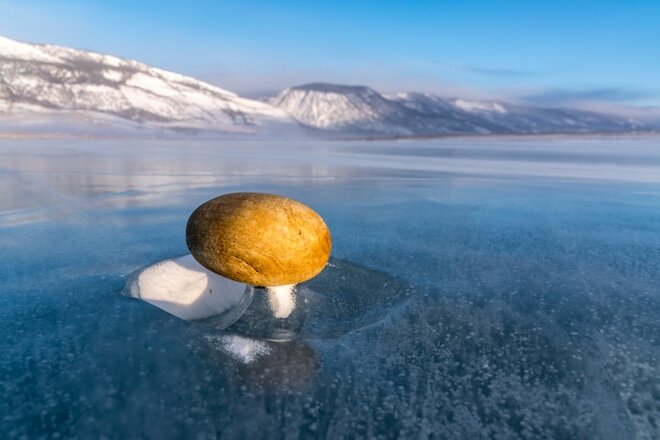 А суть проста. Берете достаточно массивный камешек, напоминающий вам шляпку боровика, и кладете его на лед озера в месте, часто освещаемом Солнцем и обвеваемом ветрами.