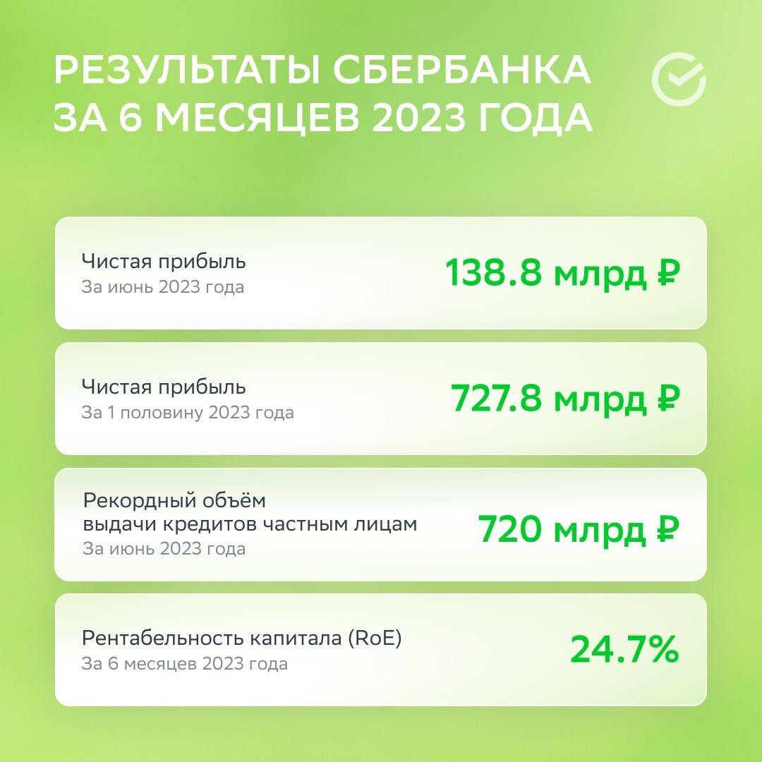 У #SBER очень много денег: чистая прибыль компании за полгода составила 727,8 млрд рублей, рентабельность капитала — 24,7%. Рис. 1. Финансовые показатели Сбера. Также Сберу удалось сохранить хорошие темпы роста розничного кредитования: Однако "зеленый" немного хитрит в отчете. Он продал дочернюю компанию в Австрии Sberbank Europe AG (за сколько, мы не знаем), и эта сделка сильно повлияла на финансовый результат. В целом Сбер с начала года вырос на 75% и заплатил солидные дивиденды. Какие перспективы, есть ли возможность дальнейшего роста? Что с котировками? Они все еще далеки от доСВОшных значений. Да и по мультипликаторам акции оцениваются всё ещё дешево. Отношение цены к балансовой стоимости чуть чуть выше 0,8 – это исторически низкий уровень. Рис. 2. Курс акций Сбера. Кроме того, Сбер раскрывает отчётность, что сегодня большой позитив для частных инвесторов. Банк России недавно говорил, что обычные "физики" чаще покупают именно те компании, которые знают сами и у которых открыта фин