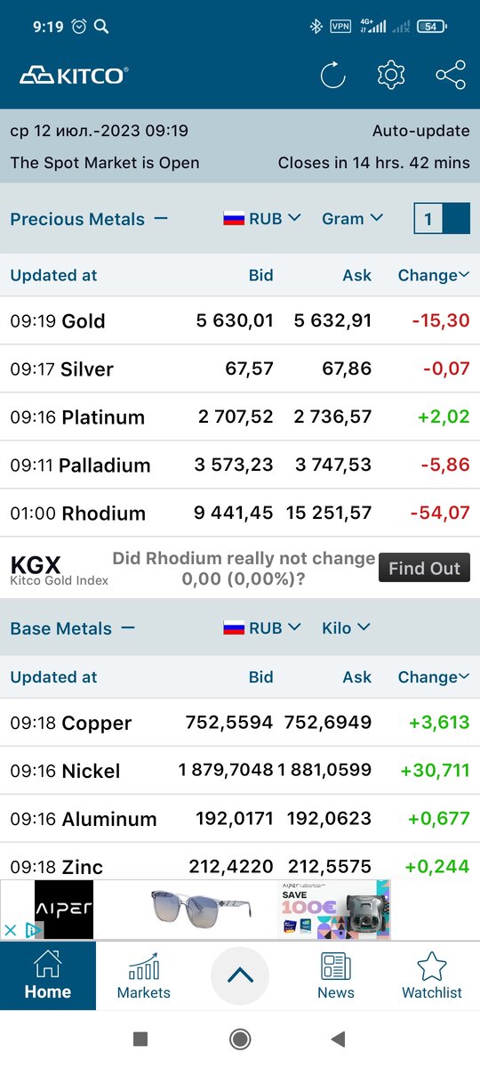 Стоимость драг.металлов и доллара на утро 12.07.2023