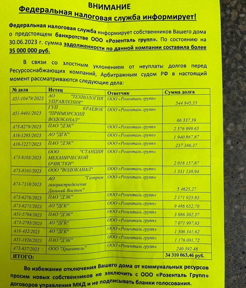 Хабаровчанин живет в доме 143Г по улице Карла Маркса. В последнее время жители раздумывают о том, чтобы сменить обслуживающую организацию. Сейчас управлением занимается УК ООО «Мецар», но есть инициаторы приглашения «Розенталь групп». Очевидно, что кто-то от этой идеи не в восторге. В доме начались настоящие информационные войны, а скорее даже дезинформационные. - В ящики начали вкидывать детского вида объявления про финансовое состояние «Розенталя» от, якобы, ФНС. Мы пытались по камерам посмотреть, кто их туда бросал. Оказалось, что они были выключены. Недавно было принято решение вовсе закрыть доступ жильцов к записям - только по заявлению и предварительной договоренности о времени просмотра. При этом запись хранится 7 дней, а отвечают на заявление до 10, то есть нужные файлы просто могут быть утеряны, - рассказал местный житель. Само объявление и впрямь смотрится довольно странно. Во-первых, «Розенталь групп» - это не конкретное юридическое лицо, а несколько предприятий, представляю