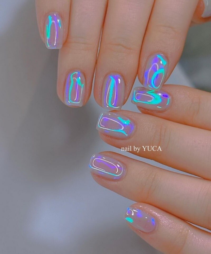 Их также называют «Aurora nails» или в японском стиле «Uruuru nails». Это одна из самых красивых тенденций нейл-арта 2023 года, которая призвана вдохнуть жизнь в изысканный переливающийся маникюр. За последние несколько лет переливающийся нейл-арт снова стал популярным благодаря мастеру маникюра Юке из Токио, которая завоевала мир, через социальные сети. Ногти «Uruuru» берут классический маникюр с эффектом северного сияния и поднимают его на новый уровень, придавая ногтям необыкновенный глянцевый и переливчатый эффект, который напоминает цвета и текстуру мыльных пузырей. Как выглядят переливающиеся УРУУРУ ногти в японском стиле? «Uruuru Nails» обычно предлагаются в версии с глазурью, с прозрачной основой и радужными отблесками. Однако они также выглядят потрясающе на более интенсивных цветных основах, таких как белый и сиреневый. Самые популярные цвета для «Uruuru Nails» — холодные оттенки, такие как розовый, синий, фиолетовый и зеленый. Однако в них также могут присутствовать неожид